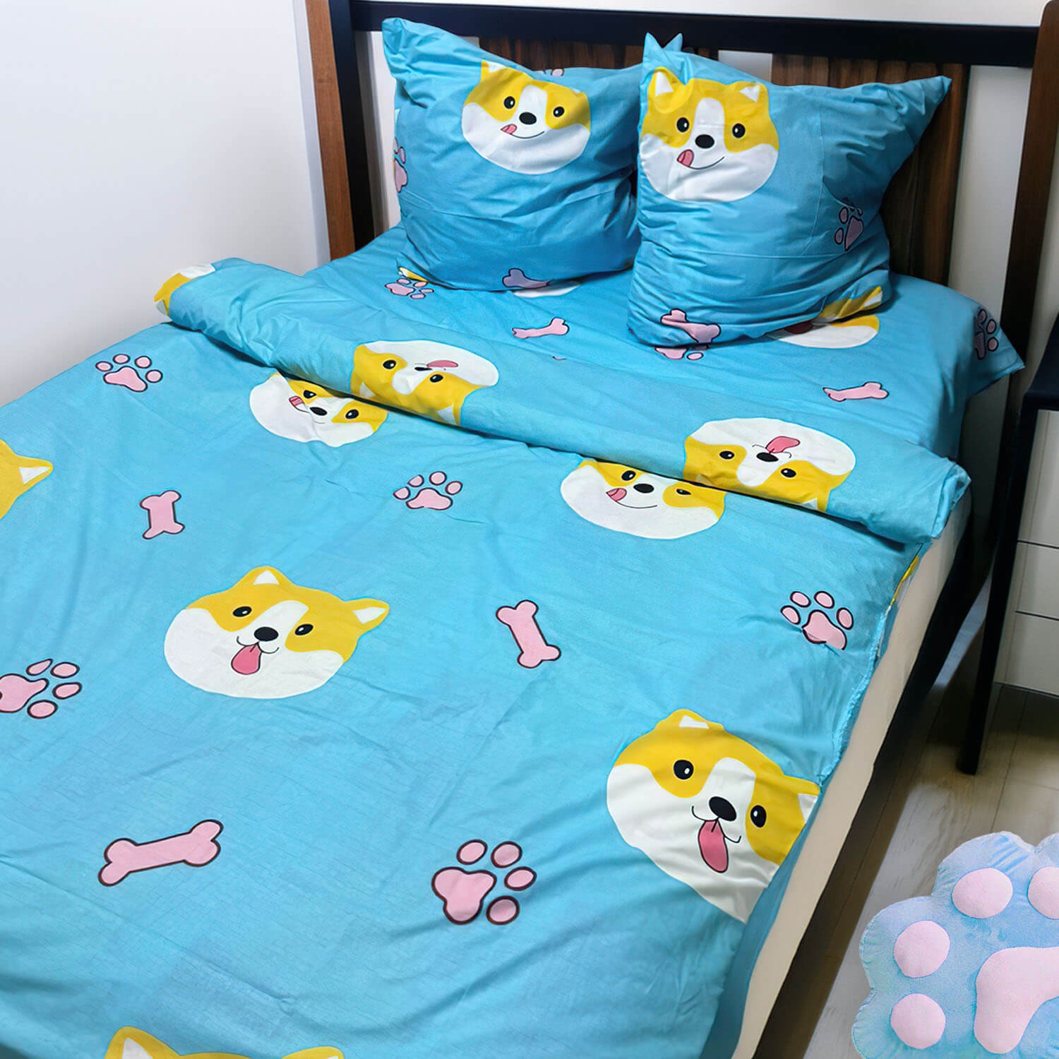 Голубой цвет и яркий рисунок с мордочками собачек украшают спальное место и дарят хорошее настроение перед сном. Натуральная ткань хорошо пропускает воздух, не раздражает кожу и подходит для ежедневного использования.