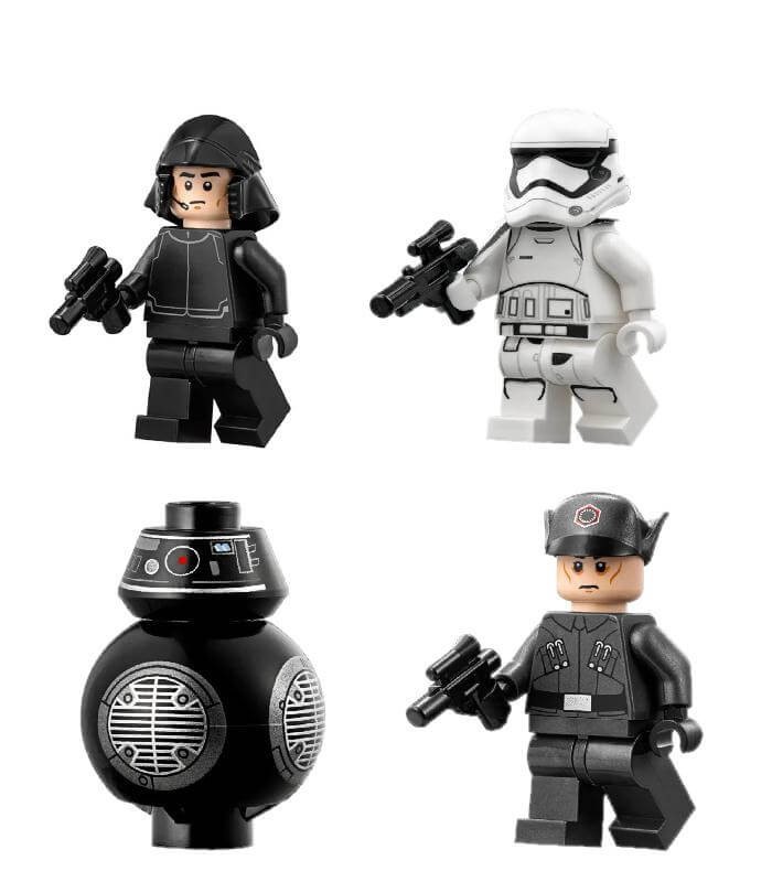 Большой конструктор Star Wars Звездный разрушитель Первого Ордена состоит из 1416 деталей и является аналогом LEGO 75190. Модель оснащена открывающимися створками, внутренними помещениями и включает 5 фигурок героев и 2 сборных дроида.