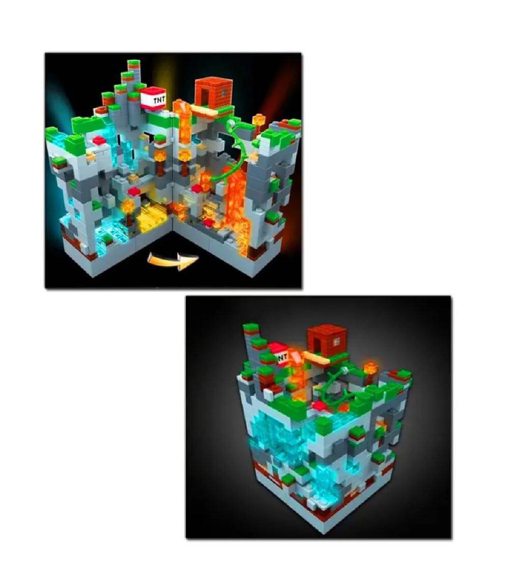 Конструктор Minecraft Битва в пещерах состоит из 858 деталей и дополнен LED блоками с подсветкой. Набор включает фигурки героев, жителя, оцелота и летучей мыши для захватывающих игровых приключений.