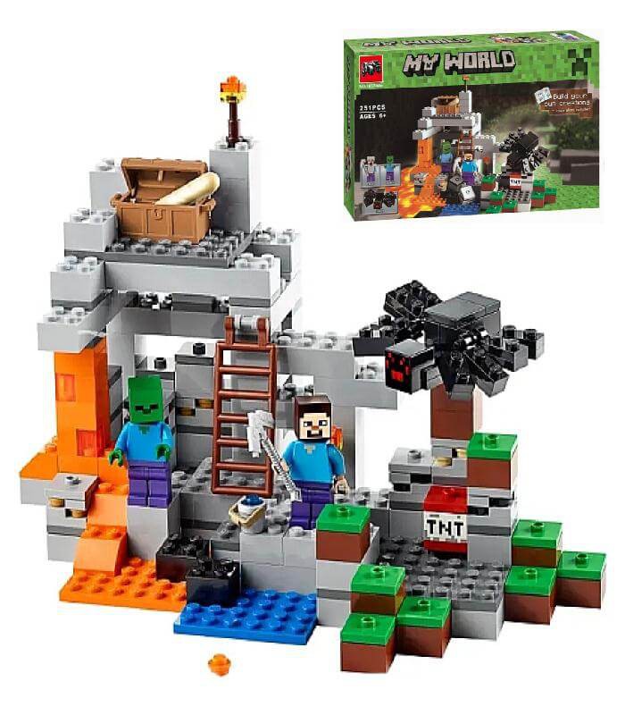 Конструктор Minecraft «Пещера Зомби» 10174А6 состоит из 251 детали. Игроки могут исследовать пещеру, добывать ресурсы и защищаться от зомби и пауков.