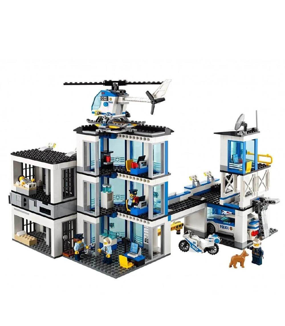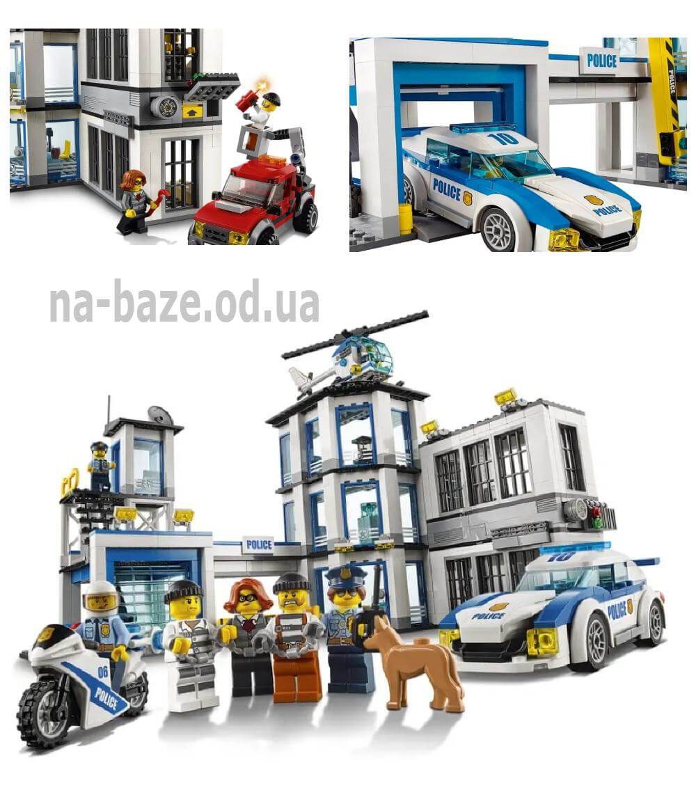 Конструктор Сити Большой полицейский участок включает 894 детали, 7 минифигурок и полицейскую собаку. В наборе полицейский участок, вертолет, машина преследования, мотоцикл и грузовик для сюжетной игры.